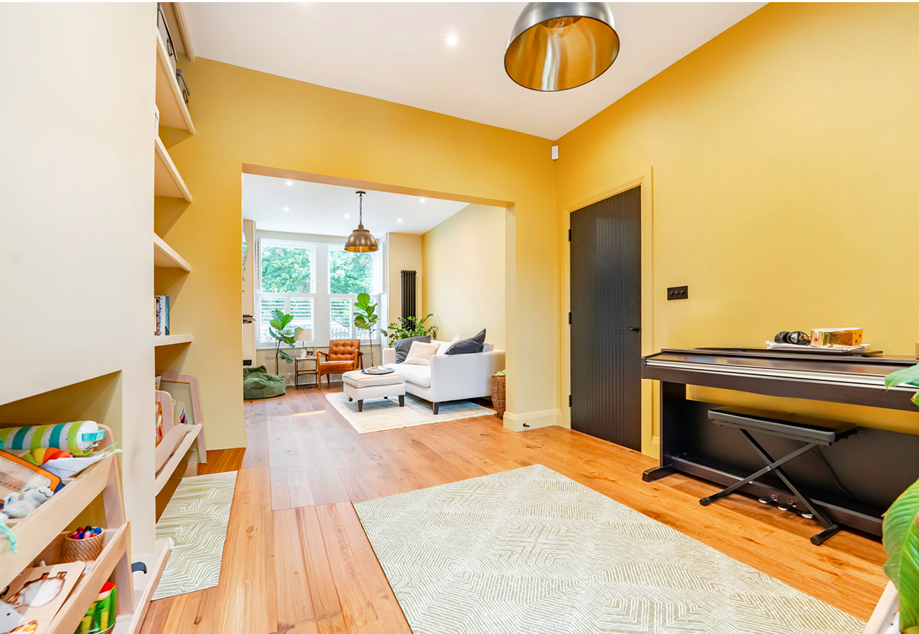 Warm wooden floors flow through most of the home, with tiles in wet areas and cosy carpets in the children’s rooms, complemented by underfloor heating, improved insulation, and soundproofing for comfort. Outside, the garden is reimagined to feel like an extension of the home, offering privacy without compromising light. Every detail, from structural updates to thoughtful finishes, reflects a careful balance of style, practicality, and family life.