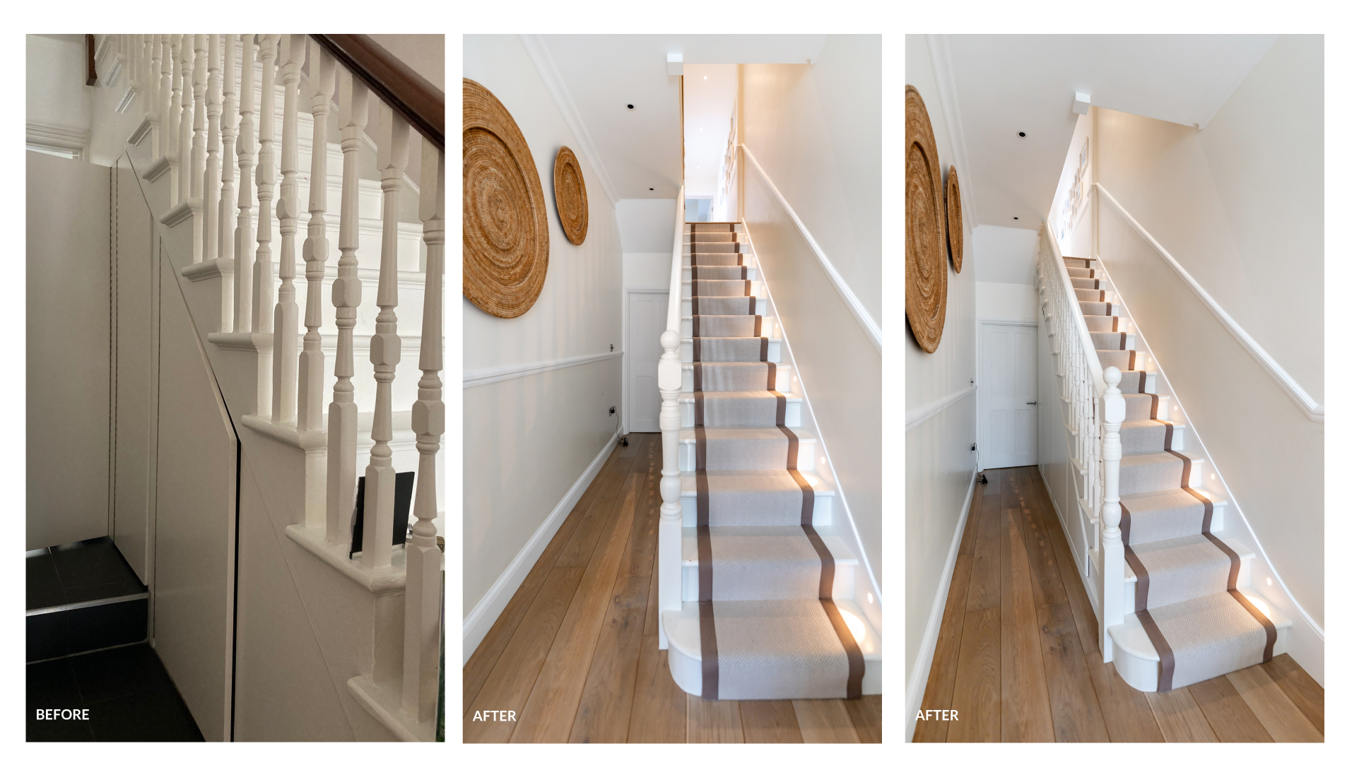 In another home renovation, the staircase became a moment of atmosphere and sensory experience rather than a structural feature. Here, the transformation was driven by material finishes and lighting integration. Our designers and lighting specialists introduced soft, indirect illumination along the treads and handrail, creating a welcoming glow that highlights the rhythm of movement while enhancing safety. A tailored carpet finish added warmth underfoot and softened acoustics, reshaping the staircase into a comfortable and intimate transition space, particularly effective in the evening when the lighting gently animates its form.